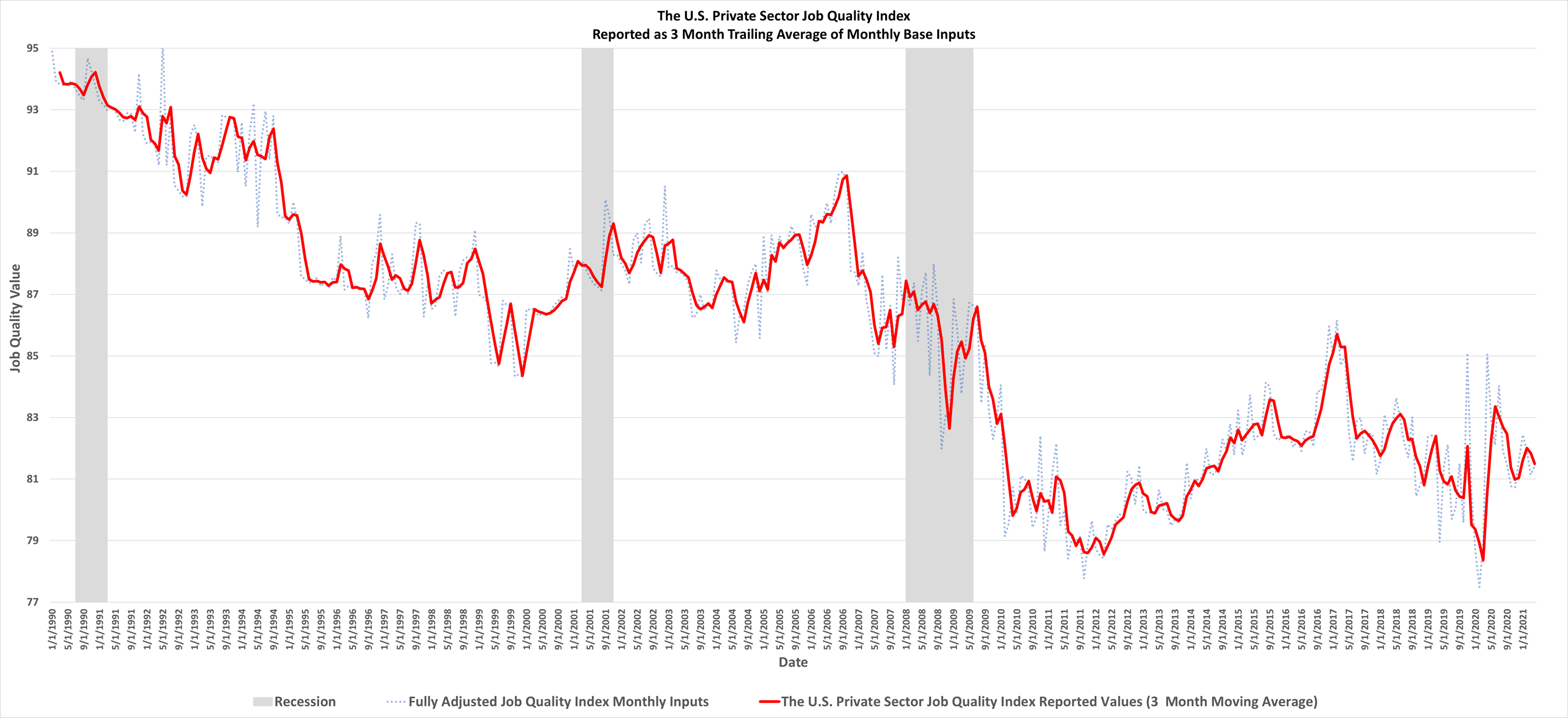 So in a few squiggly lines we can visualize the downward slump of job quality in America. (Find it here: https://www.jobqualityindex.com)