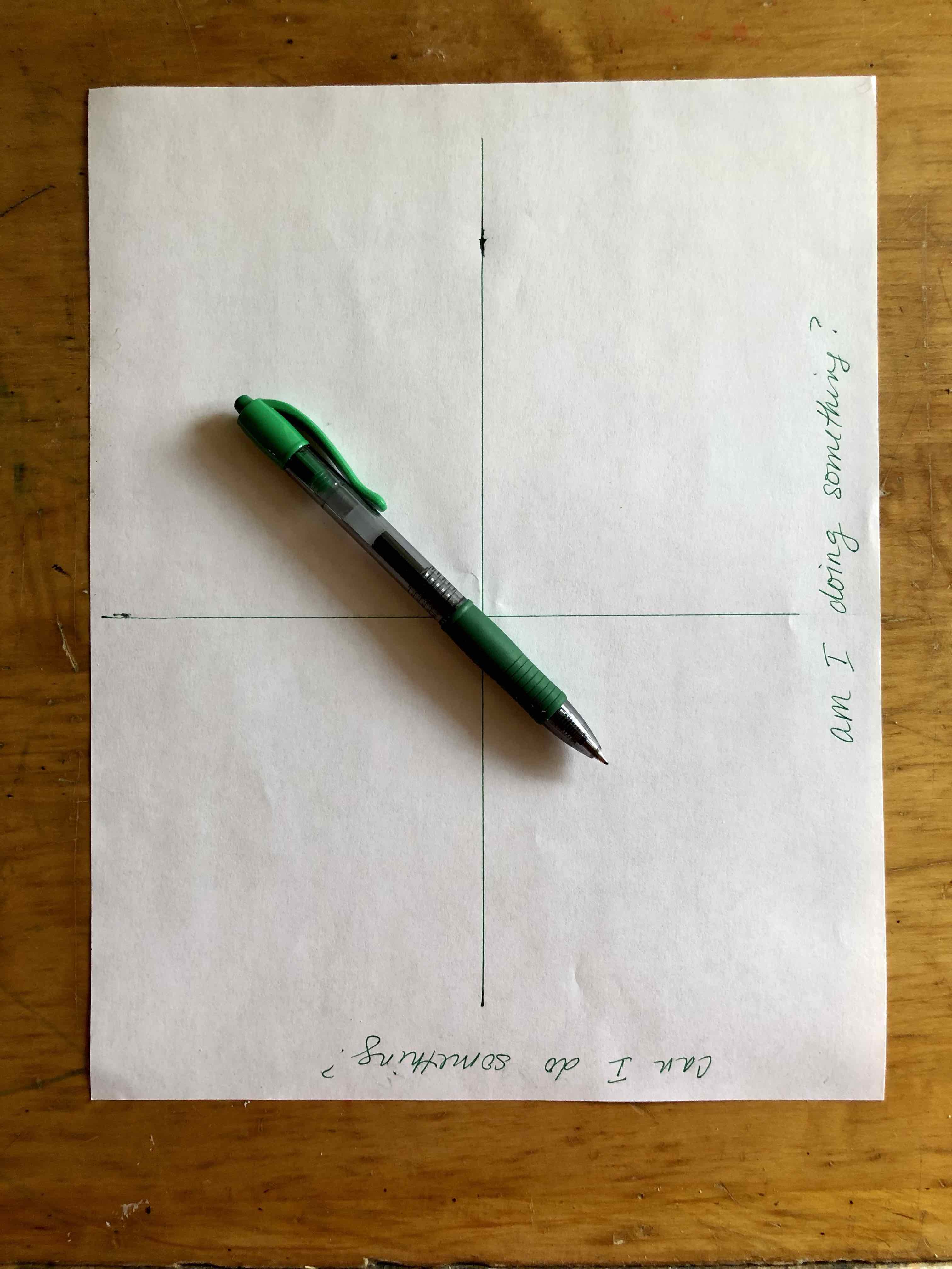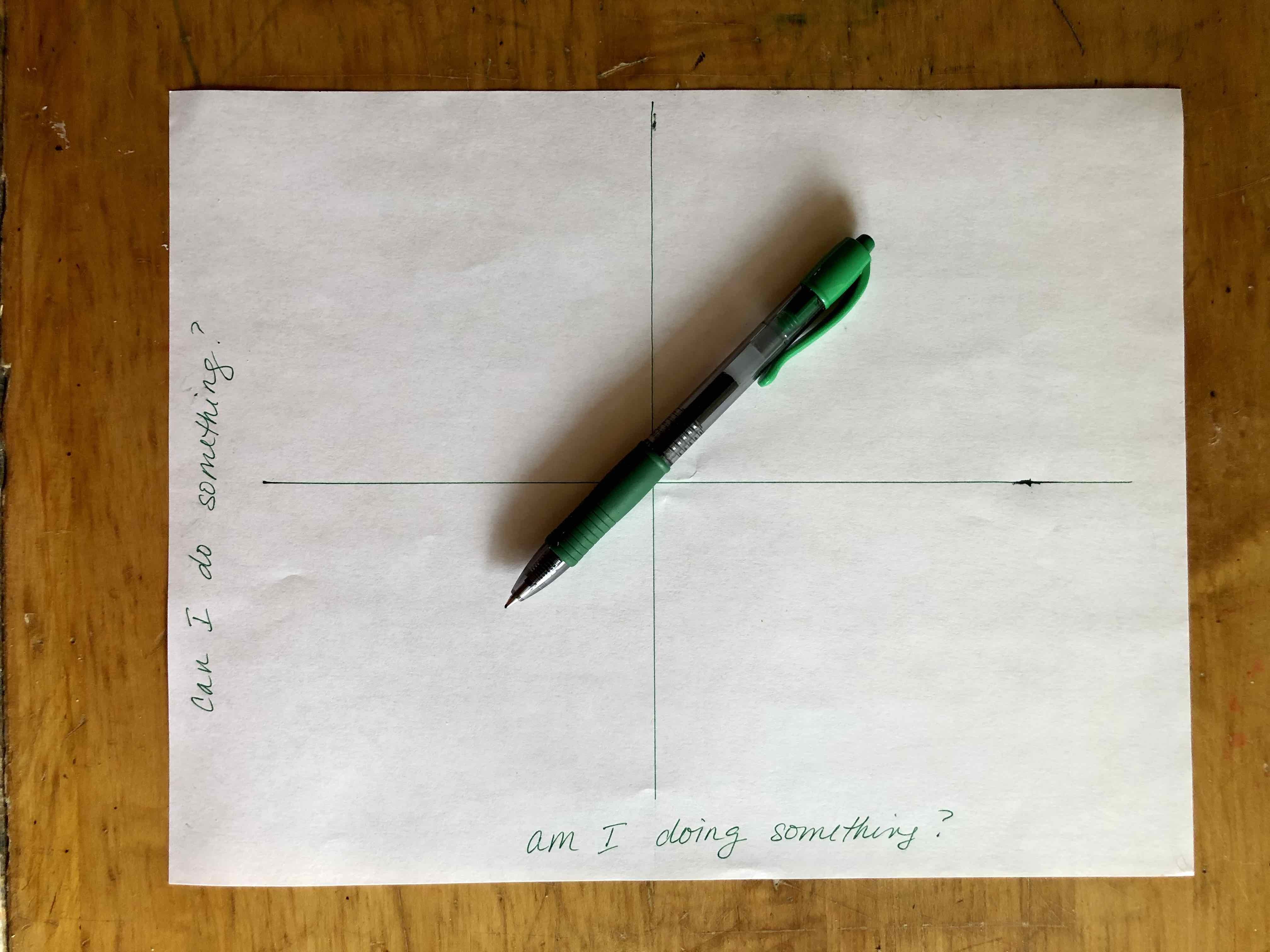 Take out a sheet of paper and a pen. Now split the paper into quadrants – either by folding the page into quarters, or just drawing them in.