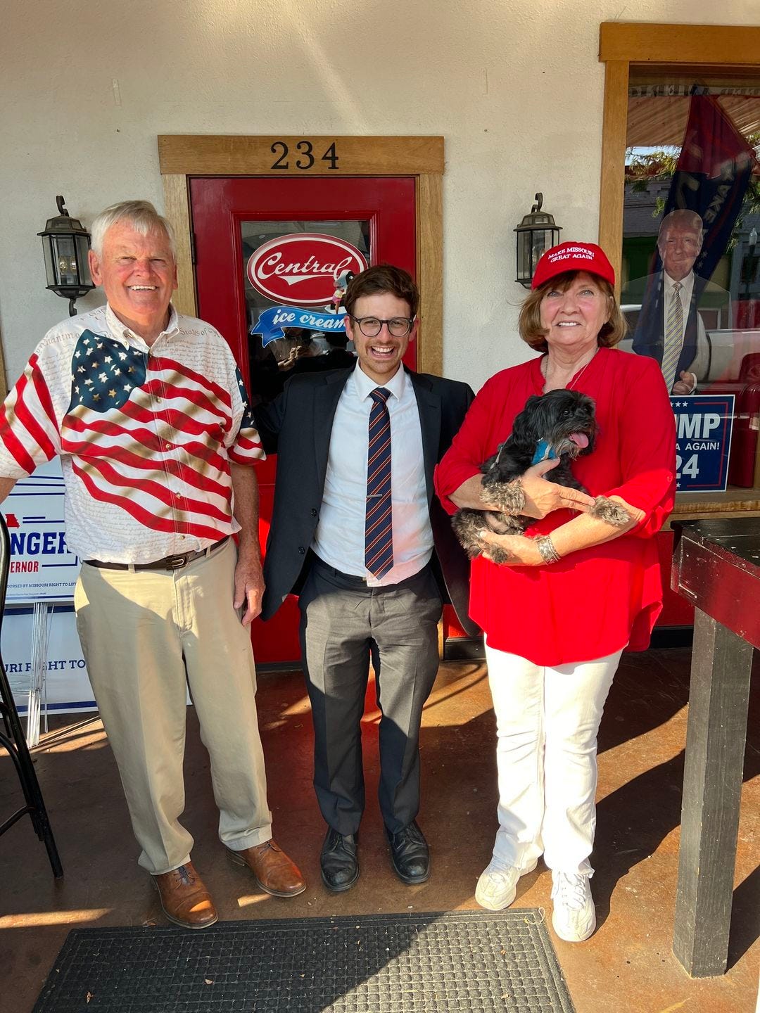 Democratic nominee for Missouri Attorney General Elad Gross and his dog Liberty Belle (a puppy mill rescue) at Trump HQ in Warsaw, MO