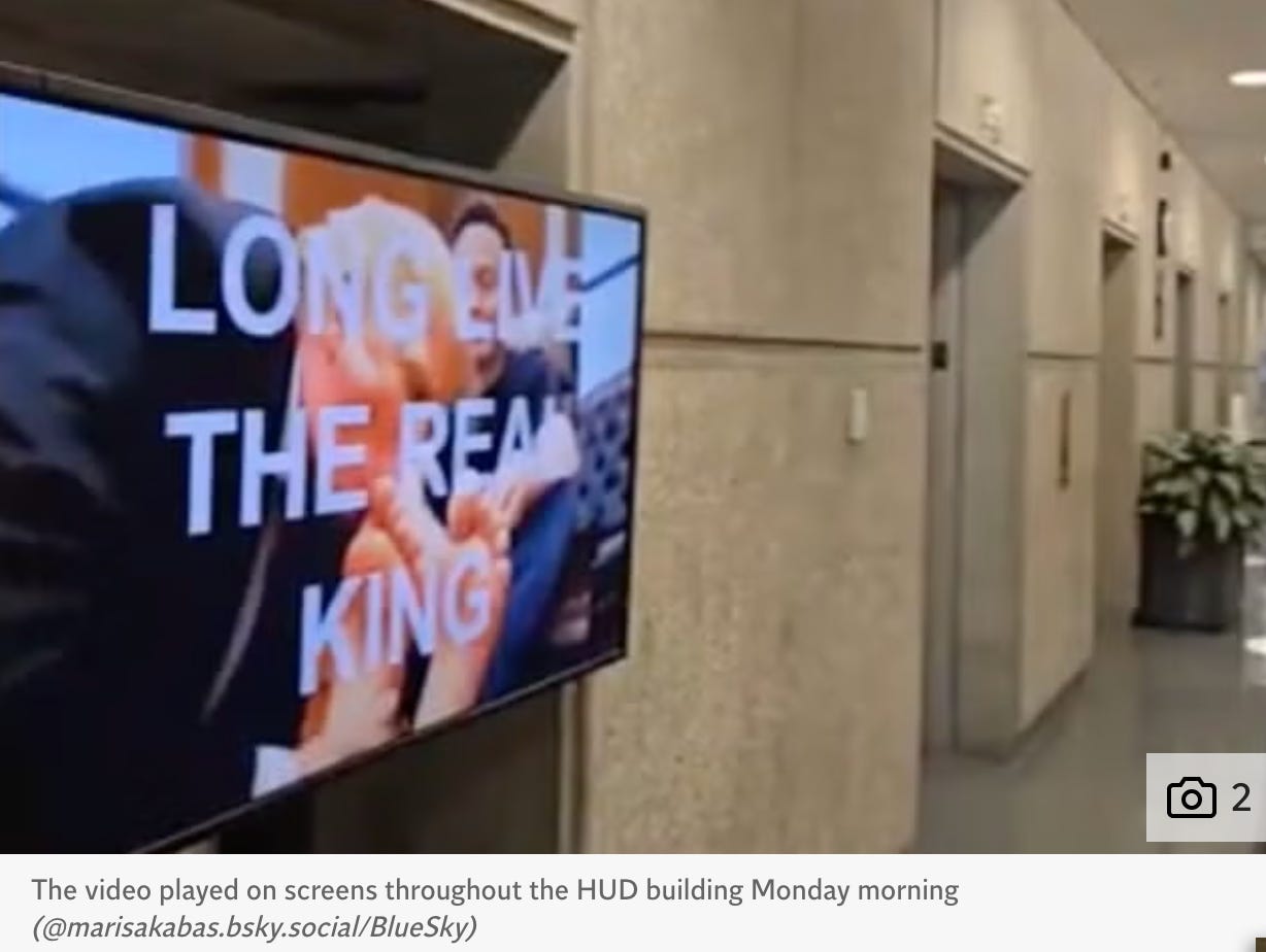 - On the day federal workers had to report back to the office, hackers broke into A/V systems at the Department of Housing and Urban Development to display an AI video parody of Donald Trump kissing Elon Musk’s feet. The video played on a five-minute loop on screens throughout the agency – from the lobby to the cafeteria. They couldn’t figure out how to turn off the screens (perhaps they fired the people who would know…) so building staff had to go floor to floor unplugging them.