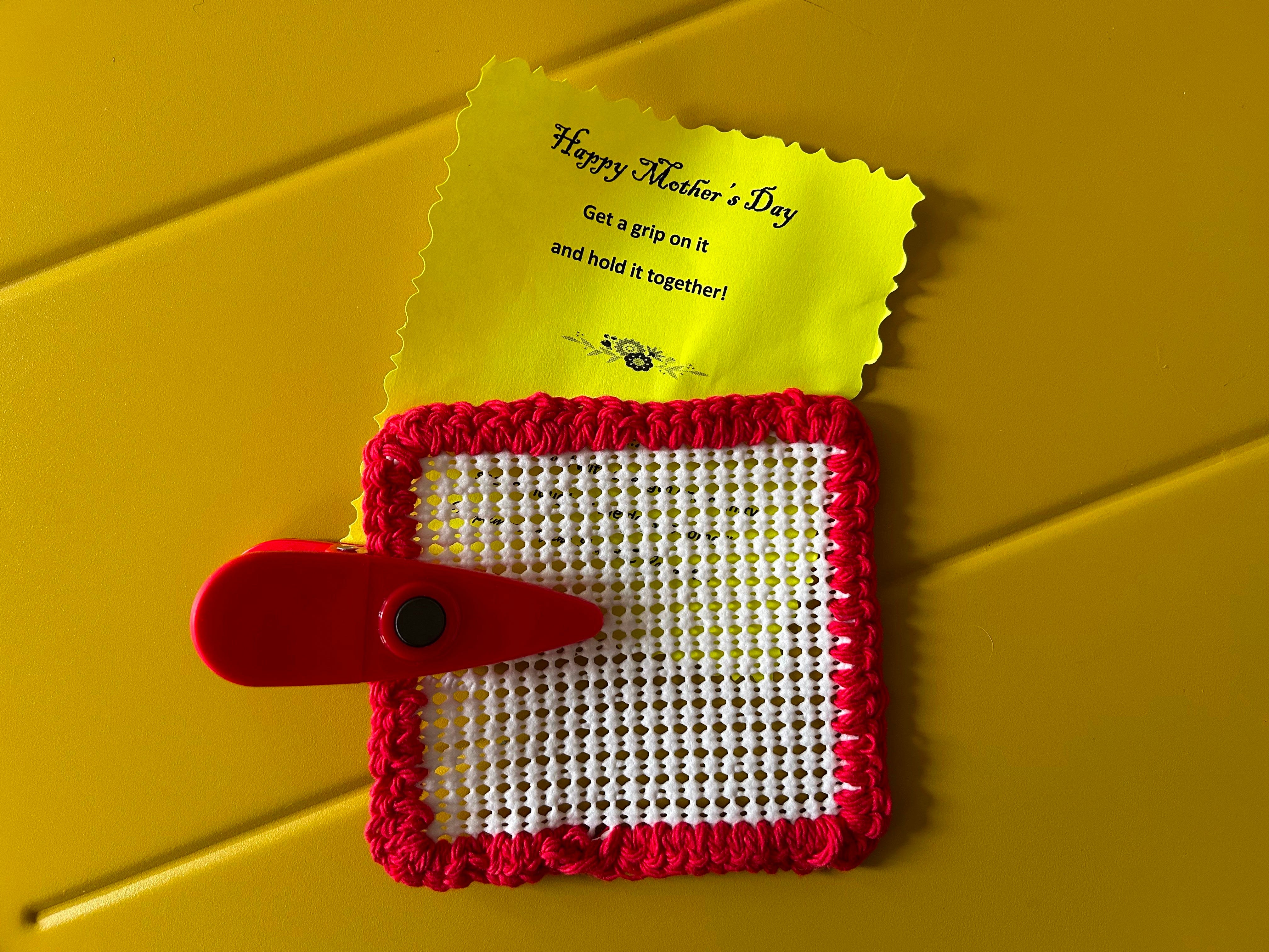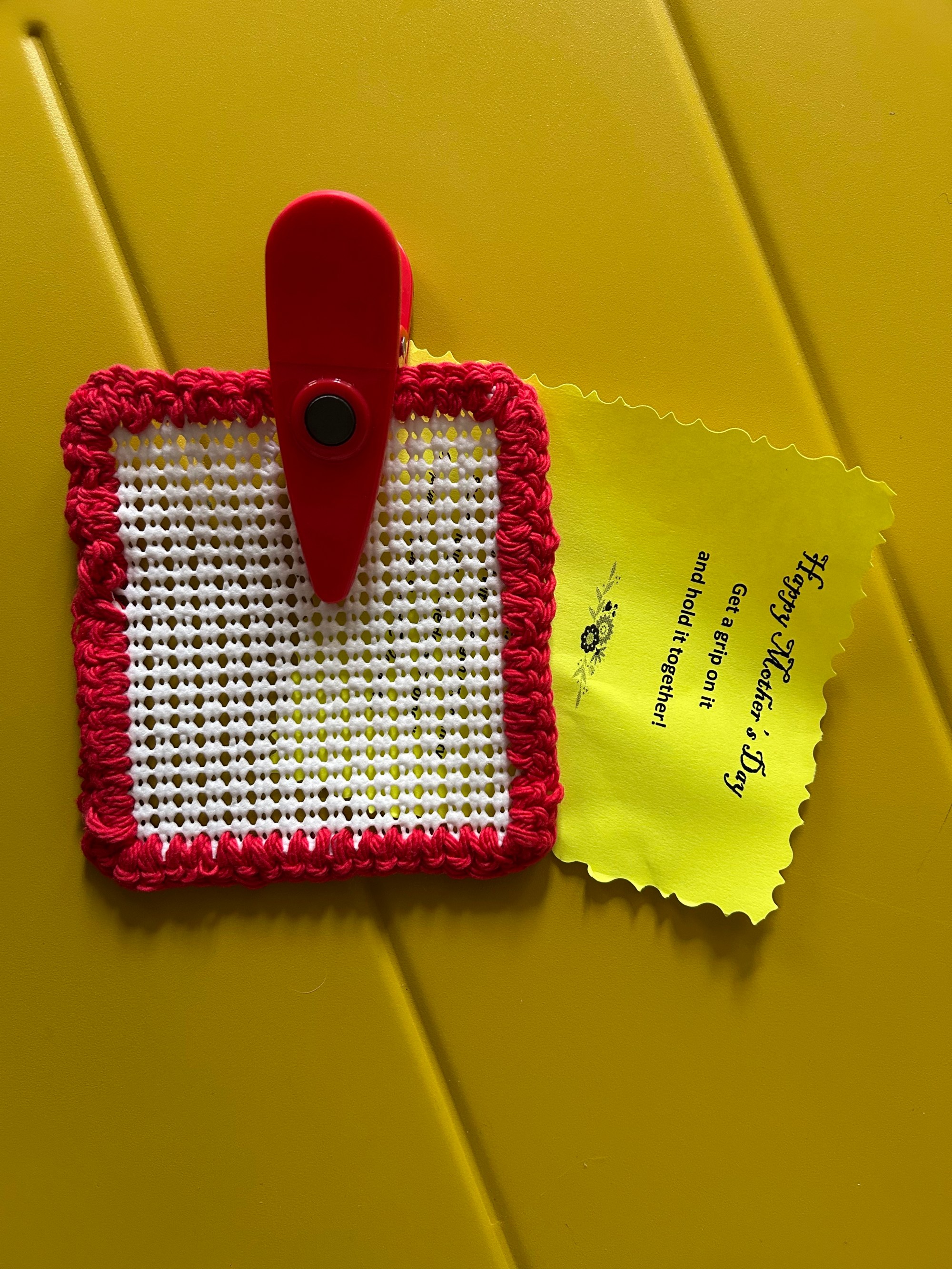 Inside the baggie was a hand-sized square of white plastic webbing, with a hand-crocheted red hem. A chip clip held a little note typed on bright yellow paper: