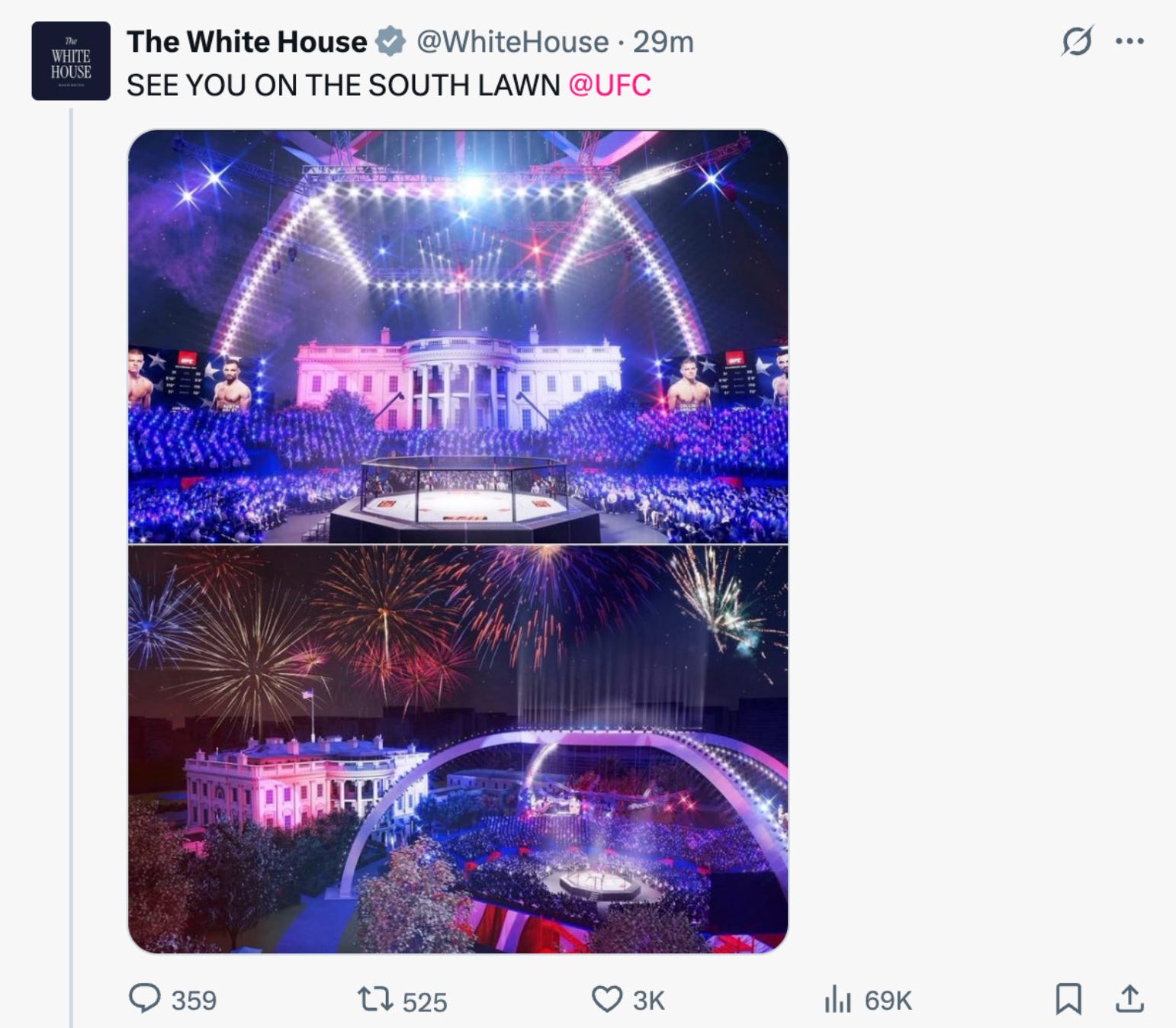 Apparently the vision for the event is to show the White House in the back of the shot; “And then … when the fight goes around to the other side, you’ll see the Washington Monument in the background.’’”