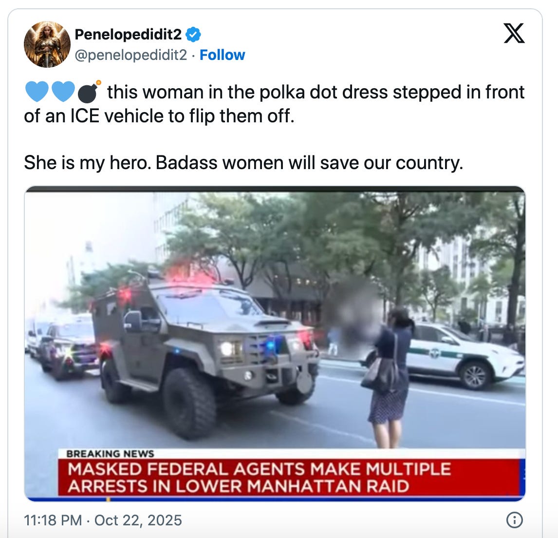She stood in the street, blocking ICE humvees – in a pose shockingly similar to Tank Man’s more than 30 years ago – purse slung over her shoulder, and two manicured middle fingers extended.