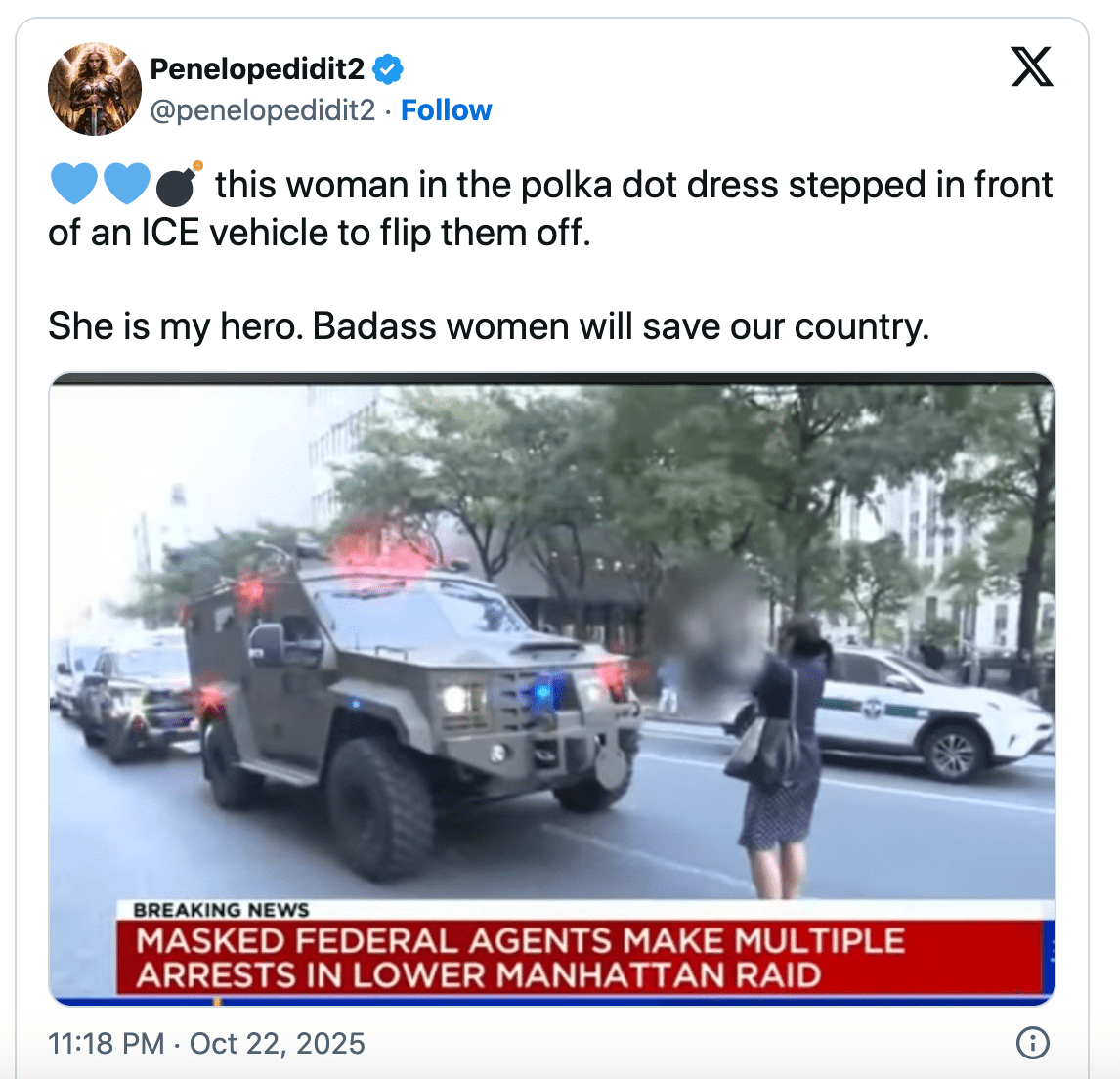 She stood in the street, blocking ICE humvees – in a pose shockingly similar to Tank Man’s more than 30 years ago – purse slung over her shoulder, and two manicured middle fingers extended.