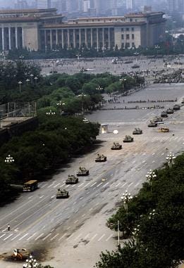 Just after noon on June 5 – the day after the brutal crackdown had begun – a line of eighteen tanks began snaking down Avenue of Eternal Peace. Lumbering along, the tanks themselves embodied governmental power – impenetrable, unstoppable, able to squash a person like a bug. They continued their parade down the Avenue, toward Tiananmen Square.