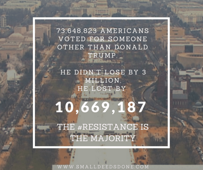 10,669,187 Trump lost the election by 10,669,187. Yes, he lost to Hillary Clinton by almost three million. But to say that he lost by only three million neglects the millions of people who voted for other candidates. So let me show you the math: 65,844,610 (votes for HRC) +7,804,213 (votes for third parties or write ins) … Continue reading We Are The Majority
